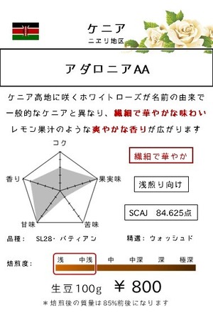 ムルエ農協 PB完売のため、 新しいケニアが入荷しました。 "アダロニア"とは、ケニア高地に咲く"白いバラ"の名前が由来になっています。 その名の通り、 甘さ・香り・酸味がハッキリとした一般的なフルボディのケニアコーヒーと異なり、 繊細で優しい香りと共に、華やかで上品な甘味を伴った、 洗練されたケニア・スペシャルティコーヒーです。 (イメージとしては、エチオピアのウォッシュドに近いかもしれません。) 生豆も大粒でキレイに揃っていて、 見た目にも質の高さが実感できると思います^^ この物価高の時代、 ムルエ農協PBに比べると価格は上がってしまいましたが、 それでも価格以上の価値は感じていただける銘柄だと思いますので、 ムルエ農協PBの正統後継銘柄として、是非お試しください(^^) 【おススメの焙煎度】 浅煎り~中浅煎り 内容量:100g(生豆時質量) *焙煎する事で、仕上がり質量は80~88%程度になります。 悪しからずご了承ください。 ◆◆現在『送料無料』で全国発送致します!!◆◆ ※計200g~のご注文をお願いしております ※計1,200円以下のご注文時は、送料が550円かかる設定にしております。 送料ご負担分として、RFブレンドを100g同封させて頂きますので、ご了承ください。 *特にご指定の無い場合、コーヒーは豆の状態でお送りしております。 ミル挽きが必要な方は、備考欄にご記入ください。 (細挽き・中挽き・粗挽き、ペーパードリップ用、フレンチプレス用など) *ご注文後、もし記載漏れがございましたら、お電話でも対応させて頂きます。 075-323-1920 (10:00-18:00 日曜定休) *配送は定形外郵便(クリックポスト)にて対応させて頂きます。 ※ご自宅のポストに投函されます *日曜日は定休日のため、月曜に焙煎&出荷させて頂きます。