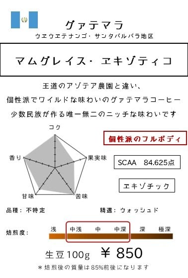 グァテマラより、個性派の新銘柄がスポットで10kg限定で入荷しました。 EXOTICO(=風変わりな、異国情緒溢れる)という名のクセ者コーヒーです。 同じグァテマラの"アゾテア農園"が、王道の正統派コーヒーなのに対して、 こちらの"マムグレイス"は、ガツンとくるボディとコクを伴った超個性派のコーヒーです。 個性派といっても、 テイスティングの評価点はアゾテア農園より高い84.625点(アゾテア農園は83.75点) その実力は折り紙付きで、アゾテア農園が万人向けであるのに対して、 マムグレイスは少しクセは強めなので、人によっては少し苦手な人もいるかもですが、 ハマる人には唯一無二の銘柄になると思います。 品種が"不特定"となっていて、これをスペシャルティと呼んで良いのか分かりませんが、 取扱いインポーターの評価は、最高ランクの『マイクロロット・プレミアム』 レベルの高さは飲んで頂けましたら分かると思います。 とはいえ、少し飲み手は選ぶ銘柄かもしれません^^; が、それも個性を楽しむスペシャルティコーヒーの魅力の一つかと思います。 是非ご賞味ください^^ 【おススメの焙煎度】 中浅入り〜中深煎り ※焙煎度によって結構印象は変わります。 焙煎度違いの味を比べるなら、2段階以上差を付けるのがオススメです。 内容量:100g(生豆時質量) *焙煎する事で、仕上がり質量は80~88%程度になります。 悪しからずご了承ください。 ◆◆現在『送料無料』で全国発送致します!!◆◆ ※計200g~のご注文をお願いしております ※計1,200円以下のご注文時は、送料が550円かかる設定にしております。 送料ご負担分として、RFブレンドを100g同封させて頂きますので、ご了承ください。 *特にご指定の無い場合、コーヒーは豆の状態でお送りしております。 ミル挽きが必要な方は、備考欄にご記入ください。 (細挽き・中挽き・粗挽き、ペーパードリップ用、フレンチプレス用など) *ご注文後、もし記載漏れがございましたら、お電話でも対応させて頂きます。 075-323-1920 (10:00-18:00 日曜定休) *配送は定形外郵便(クリックポスト)にて対応させて頂きます。 ※ご自宅のポストに投函されます *日曜日は定休日のため、月曜に焙煎&出荷させて頂きます。