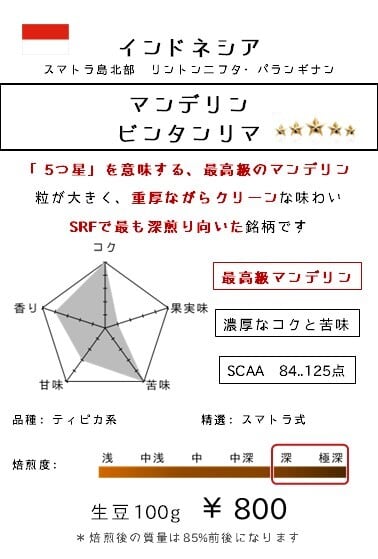 【2024.12.13 追記】 昨今の物価上昇の為、価格改定させて頂きましたm(_ _)m ~~~~~~~~~~~~~~~~~~~~~~~~~~~~~~~~~~~~~~~~~~~~~~~~ インドネシア語で「5つ星」を意味する 深いフルボディの苦味とコクを感じますが、 後味は驚くほどにクリーンなマンデリン SRFで最も苦み・コクが強い銘柄です 開業当初から、変わらぬSRFのマンデリンです。 理由は単純明快で、「これ以上のマンデリンは見つからなかったから」です。 色々サンプルを飲んでみましたが、 味・粒の大きさ・サイズの揃い・欠点の少なさ、 全てにおいて群を抜いています。 正直、仕入コストは結構高めです。 一般的なスペシャルティコーヒー専門店で扱っている、 マンデリンG1クラスの1.5倍は高い銘柄です。汗 5つ星★★★★★の名は伊達ではありません。 漆黒の豆が醸し出すフルボディの苦味、後味に残らない透明感は、 違いが分かる人にとっては圧倒的な差です!! 元ソムリエの店主の舌を唸らせた、最高のマンデリンを是非!! 【おススメの焙煎度】 深煎り~極深煎り 内容量:100g(生豆時質量) *焙煎する事で、仕上がり質量は80~88%程度になります。 悪しからずご了承ください。 ◆◆現在『送料無料』で全国発送致します!!◆◆ ※計200g~のご注文をお願いしております ※計1,200円以下のご注文時は、送料が550円かかる設定にしております。 送料ご負担分として、RFブレンドを100g同封させて頂きますので、ご了承ください。 *特にご指定の無い場合、コーヒーは豆の状態でお送りしております。 ミル挽きが必要な方は、備考欄にご記入ください。 (細挽き・中挽き・粗挽き、ペーパードリップ用、フレンチプレス用など) *ご注文後、もし記載漏れがございましたら、お電話でも対応させて頂きます。 075-323-1920 (10:00-18:00 日曜定休) *配送は定形外郵便(クリックポスト)にて対応させて頂きます。 ※ご自宅のポストに投函されます *日曜日は定休日のため、月曜に焙煎&出荷させて頂きます。