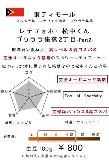 東南アジアの"東ティモール"から、 変わった名前のコーヒーが入荷しました。 ちょっと訳の分からない名前ですが、 実力は折り紙付きの、高レベルかつ高コストパフォーマンスの素晴らしいコーヒーです^^ (昨年はあっという間に完売して購入し損ねました...) SRF 取り扱い初の生産国で、 ポルトガルから独立宣言をした1975年11月28日は、 店主がこの世に生を受けた日でもある、個人的に馴染みの深い国です^^; (その9日後にまたインドネシアに占領されました) ~~~~~~~~~~~~~~~~~~~~~~~~~~~~~~~~~~~~~~~~~~~~~~~~~~~~~~~~~~~~ 東ティモール・レテフォホ地区のコーヒーの最大の特徴としては、 "過去に一度も農薬を使っていない土壌"として、 世界的にも非常に珍しいクリーンな土地で育まれたコーヒーです。 かといって、意識が高い国という訳ではなく、 インドネシアの統治下では、コーヒー産業に力を注いで貰えず、 大多数を誇る小規模農家の人々は、農薬や肥料を購入する余裕が無く、 結果として、完全無農薬の土地が出来上がったという歴史的背景があります。 (ウソみたいな本当の話です) 東ティモールでは、ハイブリッド・ティモール種が有名ですが、 このゴウララ集落の銘柄は、ブルーマウンテンやマンデリンなどで有名な 華やかな香りが特徴のティピカ種のみの銘柄で クリーンでバランスの良い、隙の無い万能型コーヒーです。 粒もそこそこ大きく、キレイに揃っていて、 生豆を見ただけでもレベルの高さを感じられると思います。 ~~~~~~~~~~~~~~~~~~~~~~~~~~~~~~~~~~~~~~~~~~~~~~~~~~~~~~~~~~~~~~ 最後に名前についてですが、 トミオフクダさんのように、"松中くん"という人が作った訳ではなく、 このゴウララ集落は、松のような木に囲まれた土地で、日除けのシェードツリーとして 松の木の中で育てられたコーヒーだから、松中くんと名付けられたそうです。 (ヒネりすぎて訳が分からないです...) "Part2"というのは、今年の第2便で届いたロットだそうです。 (第1便は速攻で売り切れました。正真正銘の人気銘柄です) 色々と突っ込みどころの多い銘柄ですが、 超万能型の高品質&高コスパ、かつ店主の生誕日とも関わりの深い、 東ティモールのスペシャルティコーヒーを是非ご堪能下さい^^ 【おススメの焙煎度】 中浅煎り~中深煎り 内容量:100g(生豆時質量) *焙煎する事で、仕上がり質量は80~88%程度になります。 悪しからずご了承ください。 ◆◆現在『送料無料』で全国発送致します!!◆◆ ※計200g~のご注文をお願いしております ※計1,200円以下のご注文時は、送料が550円かかる設定にしております。 送料ご負担分として、RFブレンドを100g同封させて頂きますので、ご了承ください。 *特にご指定の無い場合、コーヒーは豆の状態でお送りしております。 ミル挽きが必要な方は、備考欄にご記入ください。 (細挽き・中挽き・粗挽き、ペーパードリップ用、フレンチプレス用など) *ご注文後、もし記載漏れがございましたら、お電話でも対応させて頂きます。 075-323-1920 (10:00-18:00 日曜定休) *配送は定形外郵便(クリックポスト)にて対応させて頂きます。 ※ご自宅のポストに投函されます *日曜日は定休日のため、月曜に焙煎&出荷させて頂きます。
