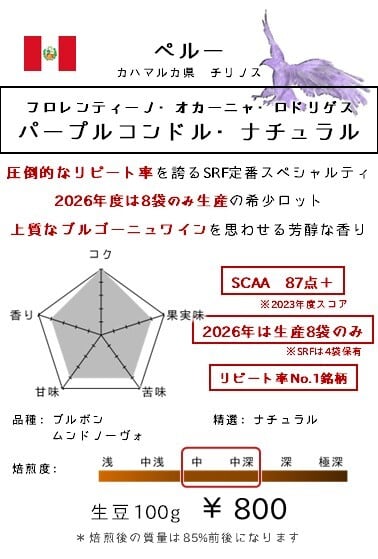 【2026.02.26追記】 SRF圧倒的No.1リピート銘柄の "パープルコンドル・ナチュラル"の2025年クロップが届きました! (価格が上がってしまい、申し訳ございませんm(_ _)m) 今年度の生産数は"8袋のみ" うち4袋を弊店で確保しています。 ~~~~~~~~~~~~~~~~~~~~~~~~~~~~~~~~~~~~~~~~~~~~~~~~~~~~~~~~~~~ SRF1番人気の"トミオフクダ・ドライオンツリー"を初めて超えた銘柄です。 それくらいインパクトがあり、誰もが"美味しい"と言わしめるほどの 圧倒的個性、かつ万人性を備えた、素晴らしい実力を持っているコーヒーです。 SCAA評価87+の高評価! ※2023年度クロップのスコアです。 直近はスコア表記はありませんが、変わらずレベルは高いです。 品種でいうと、 ブラジル・トミオフクダDOTの"ムンドノーヴォ" ブルンジ・ブジラWSの"ブルボン"の、 2つの品種を混ぜた銘柄なので、 弊店のコーヒーを飲み続けて頂いているお客様には間違いなく刺さります(^^) 焙煎レンジも幅広く、 やや浅めの中浅煎りだと、優しい果実感と柔らかな甘みが、 やや深めの中深煎りでは、円熟味のあるコクと深みのある甘みを感じられると思います。 SRFが誇る圧倒的自信を持ったスペシャルティコーヒーです。 知っている方も、知らない人も、是非ご賞味ください^^ 【おススメの焙煎度】 中煎り~中深煎り 内容量:100g(生豆時質量) *焙煎する事で、仕上がり質量は80~88%程度になります。 悪しからずご了承ください。 ◆◆現在『送料無料』で全国発送致します!!◆◆ ※計200g~のご注文をお願いしております ※計1,200円以下のご注文時は、送料が550円かかる設定にしております。 送料ご負担分として、RFブレンドを100g同封させて頂きますので、ご了承ください。 *特にご指定の無い場合、コーヒーは豆の状態でお送りしております。 ミル挽きが必要な方は、備考欄にご記入ください。 (細挽き・中挽き・粗挽き、ペーパードリップ用、フレンチプレス用など) *ご注文後、もし記載漏れがございましたら、お電話でも対応させて頂きます。 075-323-1920 (10:00-18:00 日曜定休) *配送は定形外郵便(クリックポスト)にて対応させて頂きます。 ※ご自宅のポストに投函されます *日曜日は定休日のため、月曜に焙煎&出荷させて頂きます。