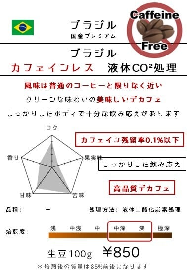 【2026.02.21 追記】 妊婦さまや、カフェインが苦手な方への機能性銘柄として、 カフェインレス銘柄の値上げは極力避けてきたのですが、 今ロットより仕入れ価格の大幅な値上げがあり、改めて価格を改定させて頂きますm(_ _)m ご愛飲頂いている皆様には、本当にご迷惑をお掛け致しますが、何卒ご了承ください。 少し価格を抑えたカフェインレス銘柄として 同時に入荷した、 メキシコ・カフェインレス・有機栽培も入荷しましたので、 比較頂けましたら幸いです。 メキシコ・カフェインレス・有機栽培 800円/100g ※生豆時 https://srfcoffee.base.shop/items/117020415 ~~~~~~~~~~~~~~~~~~~~~~~~~~~~~~~~~~~~~~~~~~~~~~~~~~~~~~~~~~~~ これまでのマンデリンカフェインレス同様、 液体CO2処理の高級カフェインレスなので、 味わいは普通のコーヒーと変わりないほどクリーンな味わいです。 ※水洗式(ウォータープロセス)のモノに比べて、コーヒーらしい風味がしっかり出ます ベースはブラジルなので、人を選ばない王道の日常使いの カフェインレスコーヒーとして飲んで頂くには最適な銘柄だと思います。 【おススメの焙煎度】 中深煎り~深煎り 内容量:100g(生豆時質量) *焙煎する事で、仕上がり質量は80~88%程度になります。 悪しからずご了承ください。 ◆◆現在『送料無料』で全国発送致します!!◆◆ ※計200g~のご注文をお願いしております ※計1,200円以下のご注文時は、送料が550円かかる設定にしております。 送料ご負担分として、RFブレンドを100g同封させて頂きますので、ご了承ください。 *特にご指定の無い場合、コーヒーは豆の状態でお送りしております。 ミル挽きが必要な方は、備考欄にご記入ください。 (細挽き・中挽き・粗挽き、ペーパードリップ用、フレンチプレス用など) *ご注文後、もし記載漏れがございましたら、お電話でも対応させて頂きます。 075-323-1920 (10:00-18:00 日曜定休) *配送は定形外郵便(クリックポスト)にて対応させて頂きます。 ※ご自宅のポストに投函されます *日曜日は定休日のため、月曜に焙煎&出荷させて頂きます。